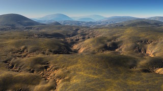 The elevation evokes alien layered plateaux. Combined with its amazing colors Color Patchwork generates an out of this world terrain that looks sometimes like a close up of a weird thick oil painting. Below a rendering of the terrain it produce in ArtMatic Voyager.