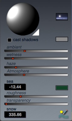 The sun direction sphere allows you to set the position of the sun that illuminates the planet. The sun's angle realistically influences the color, the shadows, and reflections. Click on any point to focus the sun's light at that point. The bright spot indicates the sun's position relative to the planet's sky dome which is represented by the sphere. When the illuminated spot is in the center of the globe, it is noon (i.e. the sun is directly overhead). When the illuminated spot is at the edge of the globe, the sun is dipping towards the horizon. In Voyager 5 it is possible to put the sound below the horizon. In no planet mode, this allows for the sun to light objects from below.