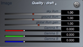 The sky modes sets the various options to render and shade the sky. There is a Sky Color picker that permits setting the sky background color. Below the sky display there may be one or more sliders visible. Their function is determined by the sky mode. The sky appearance is also influenced by the Sky Illumination Gain setting found in the Image section. This setting can have a dramatic impact on the sky appearance.