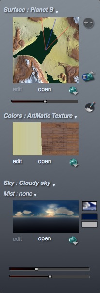 The right tool sets provides most controls for setting up the current scene : the Surface that defines the planet, the Texture that shades the planet and the Sky settings that handle sky rendering. Various UI elements and sliders may appear depending on the chosen modes for Skies and Textures.